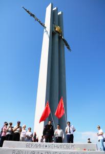 Затем праздничная колонна, раскрашенная кумачом Знамени Победы, флагов КПРФ и ЛКСМ, под звуки популярной советской песни «День Победы» двинулась к мемориалу.