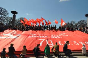 Уже второй год подряд на Пискаревское кладбище коммунисты принесли с собой гигантскую копию Знамени Победы – огромное красное полотнище площадью 144 квадратных метра, изготовленное по инициативе Военно-патриотического клуба «Комсомолец».