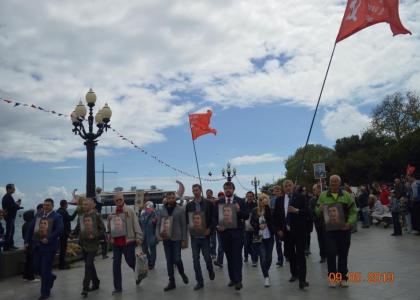 Также коммунисты прошлись колонной по Набережной имени Ленина с портретами генералиссимуса Советского Союза Иосифа Виссарионовича Сталина. В целом ялтинцы положительно оценили такую инициативу коммунистов и осудили так называемую рекомендацию «организаторов» бессмертного полка, которые призывали отказаться от красных знамен и портретов людей, не являющихся родственниками, даже если они известные военачальники Великой Отечественной Войны.
