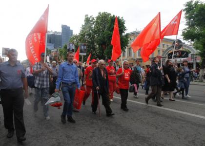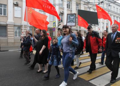 В День Победы воронежские коммунисты и их сторонники приняли участие в общегородских мероприятиях, включая шествие Бессмертного полка, и провели свой митинг у памятника Жертвам белого террора под красными флагами СССР и знамёнами Победы.