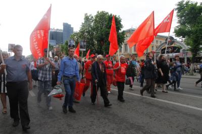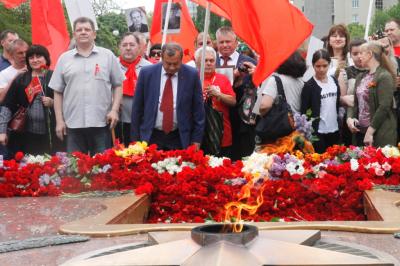 В День Победы воронежские коммунисты и их сторонники приняли участие в общегородских мероприятиях, включая шествие Бессмертного полка, и провели свой митинг у памятника Жертвам белого террора под красными флагами СССР и знамёнами Победы.