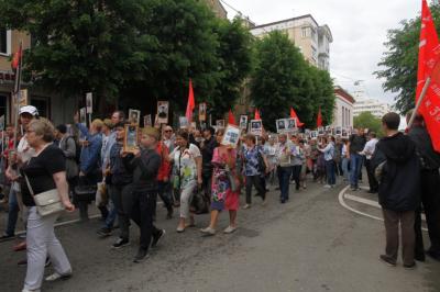 По окончании митинга его участники во главе с секретарями обкома С.И. Рудаковым, А.И. Рогатневым и Д.В. Росликом встали в многотысячные ряды Бессмертного полка и пронесли красные знамёна, портреты Верховного главнокомандующего И.В. Сталина и других советских полководцев через центр от площади им. Ленина к площади Победы, где возложили красные гвоздики к Вечному огню и мемориалу защитникам Воронежа.