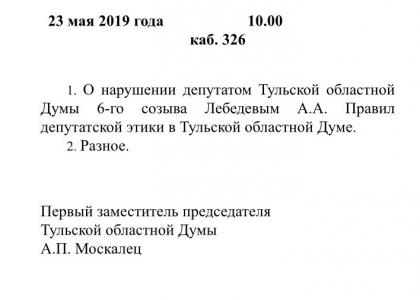 вопрос о его снятии с должности заместителя председателя областной Думы, первый