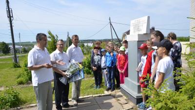 к памятному знаку возложили А.Н. Вражкин, А.Д. Фёдоров, директор школы А.Н.