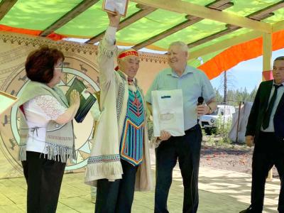 одному из зачинателей праздника, председателю Совета старейшин эвенков России Ивану Михайловичу Атласову.