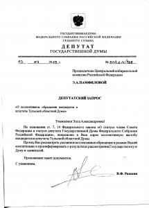 Кандидаты в депутаты Тульской областной Думы 7-го созыва, а также собраний депутатов муниципальных образований Тульской области направили коллективную жалобу Председателю Центральной избирательной комиссии РФ Э.А. Памфиловой. Депутат Госдумы В.Ф. Рашкин направил соответствующий запрос в ЦИК,