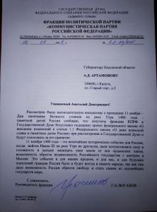 Председатель ЦК КПРФ Г.А. Зюганов направил письмо губернатору Калужской области А.Д. Артамонову.