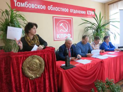 По вопросу организации мероприятий, связанных с проведением единого дня голосования, а также работы областного избирательного штаба выступила секретарь Тамбовского ОК КПРФ Е.В. Козодаева.