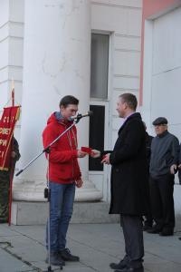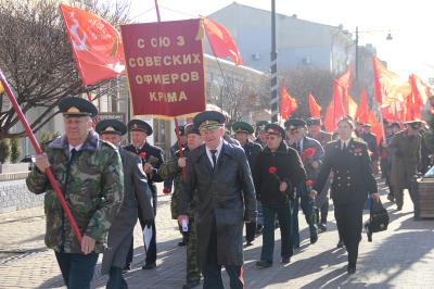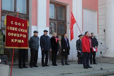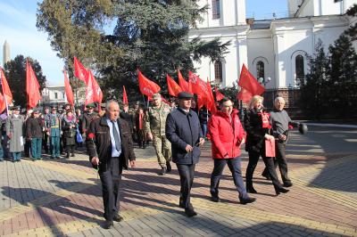 Руководители Крымского республиканского комитета, коммунисты и комсомольцы, члены Союза Советских офицеров, дети войны и сторонники КПРФ вышли на митинг на площадь Советскую возле памятника «Выстрел в спину», установленного крымскими коммунистами пятнадцать с половиной лет назад в память о тех гражданах, которые погибли от рук пособников фашистов и так же собой являют пример героизма, где поздравили горожан с праздником, вручили партийные и комсомольские билеты.