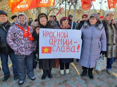 С приветственным словом выступила лидер коммунистов региона Тамара Казанцева. Она отметила, что с разрушением Советского Союза армия была брошена на произвол судьбы. Военные оказались без жилья, вооружение и техника осталась без присмотра. Боевой мощи страны был нанесён непоправимый ущерб. Так же у микрофон был депутат-коммунист Тюменской областной Думы Левченко Иван Григорьевич. Он отметил, что КПРФ стоит на защите интересов народа, активно борется с мусорной, пенсионной и другими антинародными реформами. Из депутатов Тюменской городской думы выступали Пыхалов Сергей Анатольевич и Дранчук Юрий Викторович. Все выступающие подчеркивали, что Красная Армия в первую очередь защищала свой народ и не преследовала завоевательских амбиций