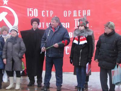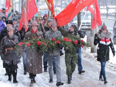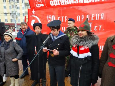 Коммунисты с алыми стягами и знаменами различных родов войск Советской армии на площади Победы скандировали лозунги: «Да здравствует Советская Армия и Военно-Морской Флот!», «Армия! Будь с народом! Вместе – победим!», «Слава защитникам Отечества!», «Армии и Флоту – лучшее оружие и современную технику!».