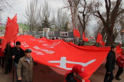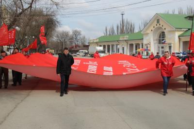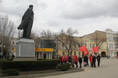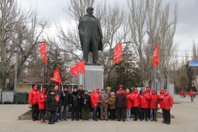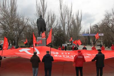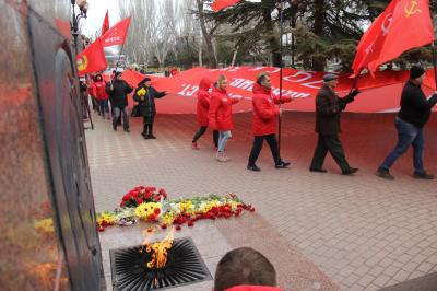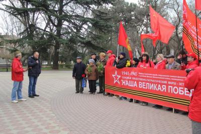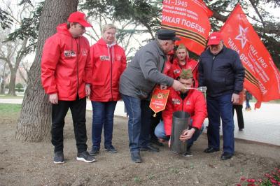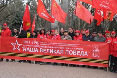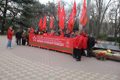 В Феодосии на Привокзальной площади у памятника В.И. Ленину присутствующие коммунисты и представители общественных организаций развернули красное полотнище копии Знамени Победы и пронесли его по улице до мемориального комплекса Вечный огонь, расположенного в парке Юбилейный, Они возложили цветы и почтили память героев и жертв Великой Отечественной войны минутой молчания, а также набрали землю в капсулу памяти.