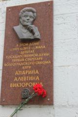 Сегодня, 20 апреля, по инициативе областного комитета КПРФ и регионального отделения «ВЖС — Надежда России» у мемориальной доски, посвященной депутату Государственной Думы РФ шести созывов, первому секретарю Волгоградского обкома КПРФ Алевтины Апариной состоялось памятное мероприятие, посвященное 79-летию со дня ее рождения. У мемориальной доски известного политического и общественного деятеля были возложены живые цветы.