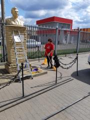 Три дня сотрудники аппарата обкома трудились над ремонтом бюста И.В. Сталина, сооружением металлической конструкции под установку нового баннера, покраской ограждения и самого бюста.