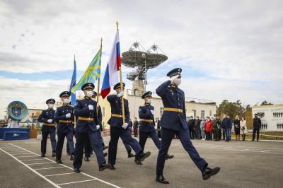 После яркого парада личного состава знаменная группа внесла под звуки марша Преображенского полка Государственный флаг Российской Федерации, флаги Воздушно-Космических сил и Космических войск.