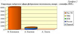 Рассмотрим на графике, как распределялось эфирное время В. Коновалова, А. Клычкова и А. Локотя на пяти ведущих телеканалах в 2020 году (Гр.2).