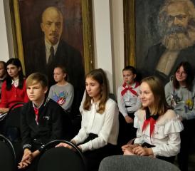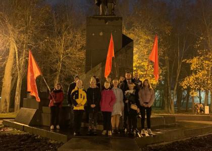 Затем участники и организаторы отправились на Софийскую площадь, где возложили цветы к памятнику В.И.Ленина, в честь 102-й годовщины со Дня основания Ленинского Коммунистического Союза Молодёжи.