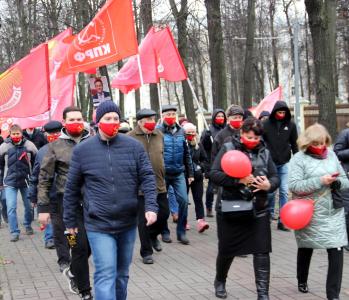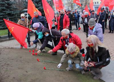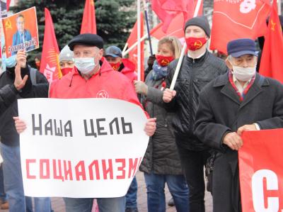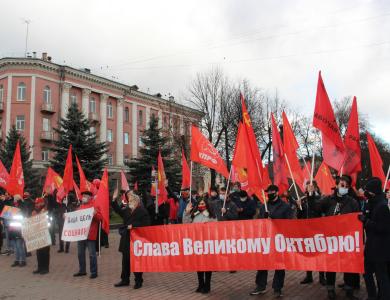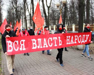 По ходу движения звучали призывы ЦК КПРФ в честь 103-й годовщины Великого Октября: «Слава Великому Октябрю!», «Рабочий, борись за свои права!», «Наша цель – социализм!», «Да здравствует Великая Октябрьская социалистическая революция!».