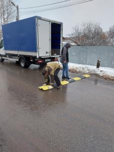 25 ноября на дороге установили два лежачих полицейских. Они изготовлены из ударопрочной резины и крепятся с помощью анкерных болтов. Высота составляет 5 сантиметров. Такие неровности хорошо видны издалека, так как частично окрашены в желтый цвет.