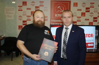В самом начале встречи лидер коммунистов округа, депутат Собрания депутатов НАО Михаил Райн поблагодарил Андрея Сергеевича Николаева и его команду, тех, кто работал над книгой за столь значимый кропотливый труд. Вручил памятную медаль ЦК КПРФ «75 лет Великой Победы» и почетную грамоту окружкома за патриотическое воспитание жителей округа.