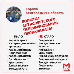 1-го декабря на заседании городского собрания Корочи глава районной администрации Николай Нестеров вынес на рассмотрение вопрос о переименовании ряда улиц города: К. Маркса, Интернациональной, Урицкого, К. Либкнехта, Пролетарской, Дзержинского, Володарского, Октябрьской, переулков К. Либкнехта и Кромского. Аргумент у чиновника был поразительный: он пообещал это сделать губернатору Евгению Савченко. Такой подход удивил даже депутатов-единороссов: причем тут ушедший в отставку Савченко, если это вопрос местного значения? Кроме того, в прошлом году вопрос о переименовании уже поднимался. Но жители Корочи выступили против, а горсобрание не пошло против граждан.