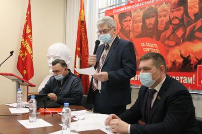 Первый секретарь Псковского ОК КПРФ Петр Алексеенко вручил секретарям местных отделений грамоты по итогам соцсоревнования и памятные подарки и партийные награды недавним юбилярам и именинникам.