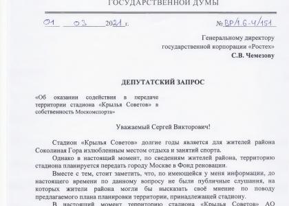 В начале марта в адрес координатора народной приемной депутатов Госдумы и МГД от КПРФ С.П. Обухова поступило обращение от одной из жительниц района "Соколиная Гора" с просьбой помочь прекратить застройку территории легендарного стадиона «Крылья Советов».