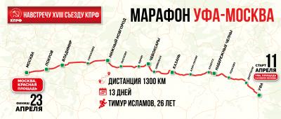 Сегодня при поддержке ЦК КПРФ и Башкирского Республиканского комитета КПРФ, депутат Госдумы Александр Ющенко, первый секретарь Башкирского рескома Юнир Кутлугужин, а также депутаты от фракции КПРФ Курултая Ильгам Галин и Альберт Газизов дали старт марафону Уфа-Москва. Мероприятие проведено накануне 60-летия со дня первого полёта человека в космос и приурочено дружбе братских народов СССР и предстоящему XVIII съезду КПРФ.