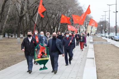 В полдень группа коммунистов, комсомольцев и сторонников партии собралась возле памятника революционеру Федору Мухину в центре Благовещенска. Развернув красные знамёна и взяв в руки цветы и венки, участники акции построились в колонну с соблюдением всех санитарных требований о социальной дистанции и выдвинулись в сторону памятника В.И. Ленину. Возглавили шествие лидеры Амурской областной и Благовещенской городской организаций КПРФ Роман Кобызов и Кирилл Тандуров.