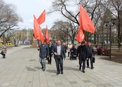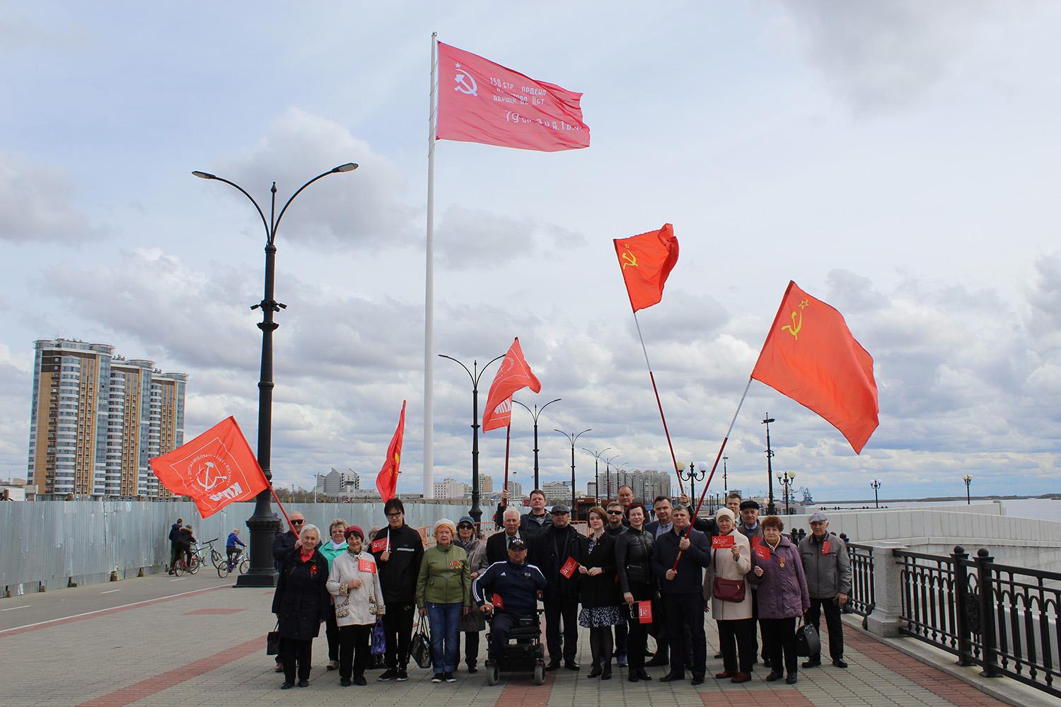 7 мая активисты благовещенской городской организации КПРФ посетили набережную Амурской столицы, где в честь 76-ой годовщины Победы советского народа в Великой Отечественной войне на 75-метровом флагштоке была поднята историческая копия Знамени Победы. Возглавили колонну руководители областной и городской партийных организаций Роман Кобызов и Кирилл Тандуров.