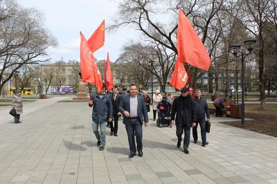 7 мая активисты благовещенской городской организации КПРФ посетили набережную Амурской столицы, где в честь 76-ой годовщины Победы советского народа в Великой Отечественной войне на 75-метровом флагштоке была поднята историческая копия Знамени Победы. Возглавили колонну руководители областной и городской партийных организаций Роман Кобызов и Кирилл Тандуров.