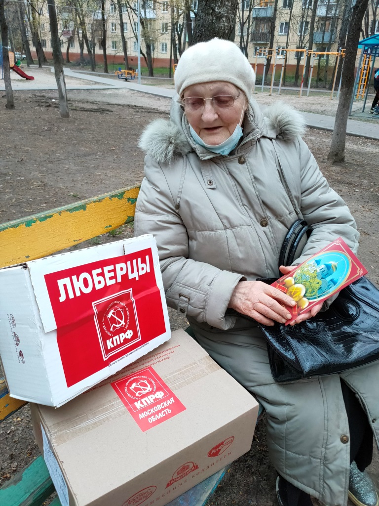 Первый секретарь Люберецкого ГК КПРФ сказал: «Спасибо Московскому областному Комитету КПРФ, лично Владимиру Ивановичу Кашину, заместителю Председателя ЦК КПРФ за постоянное внимание и заботу о ветеранах, всем кто нуждается в помощи коммунистов. Сегодня мы вручаем подарки к майским праздникам самым нуждающимся. Конфеты и печенье к чаю получили ветеранские организации: «Союз пенсионеров и инвалидов» и красковское общество инвалидов».