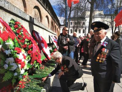 От памятника Владимиру Ильичу Ленину колонна Новгородских коммунистов направилась к мемориалу "Вечный огонь славы", для возложения у кремлёвской стены цветов и венков. Затем двинулась к монументу Победы.