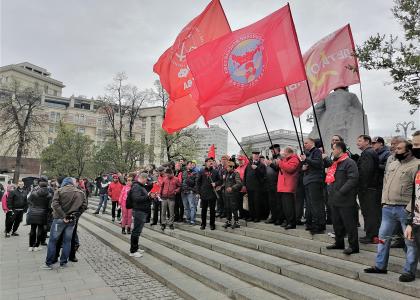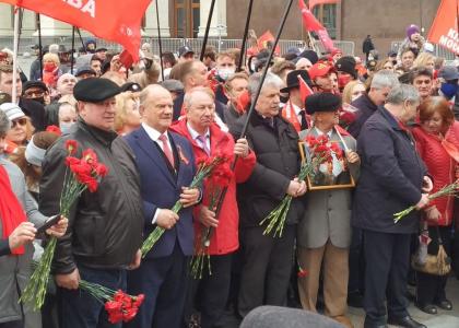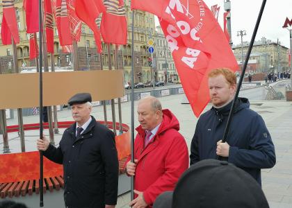 Депутаты Госдумы В.Ф. Рашкин, Д.А. Парфенов и руководитель фракции КПРФ в Мосгордуме Н.Г. Зубрилин прошли от Пушкинской пл. по центру Москвы, неся Знамя Победы, флаги СССР и КПРФ.