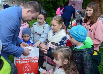 После выступлений, А.Д. Бойков и Е.А. Горбачев вручили небольшие поздравительные наборы каждому из детей. С ответной благодарностью вышла одна из родителей и вручила представителям КПРФ подарки, которые дети сделали своими руками.