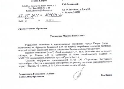 В приёмную депутата Городской Думы г.Калуги от КПРФ Марины Костиной в конце апреля поступила коллективная жалоба пенсионеров и ветеранов труда на аварийное состояние лестницы к пункту реализации единых социальных билетов в городе Калуге, который находится по адресу: ул.Ленина, д.65Б, неудовлетворительные организацию и условия для пожилых людей при организации выдачи социальных билетов.