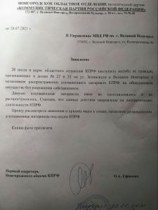 Просим рассмотреть данное заявление и принять меры к лицам, незаконно размещающим агитационные материалы под видом КПРФ".