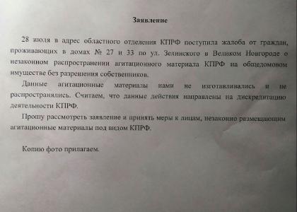 Просим рассмотреть данное заявление и принять меры к лицам, незаконно размещающим агитационные материалы под видом КПРФ".