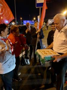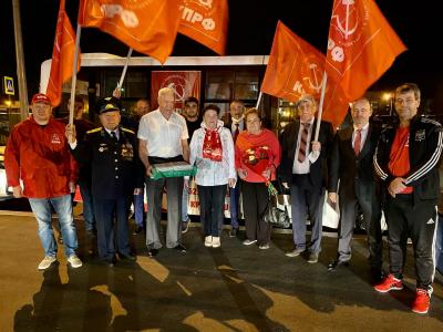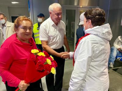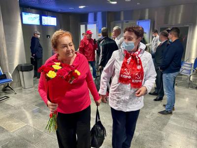 Коммунисты города Тюмени в аэропорту Рощино встретили гостя торжественно и празднично, с цветами и пирогами.