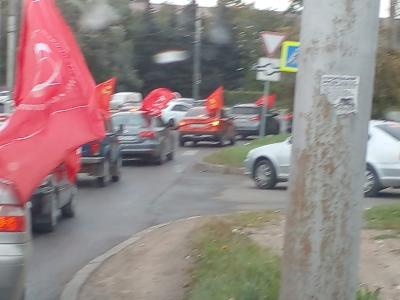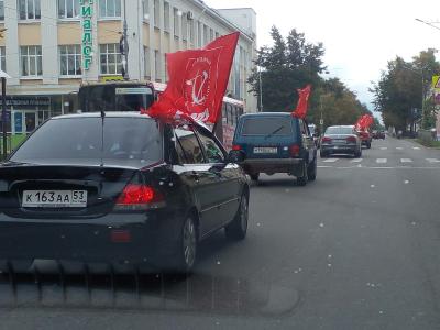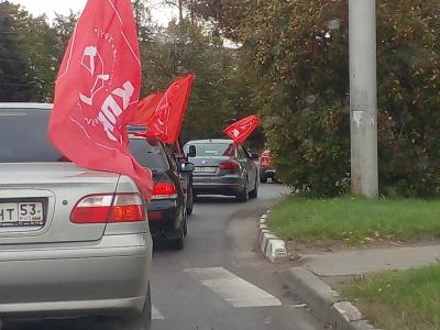 Сегодня, 15 сентября в Великом Новгороде в рамках Всероссийской акции протеста "За КПРФ - вместе победим" состоялся автопробег. Автомобили под красными знамёнами с символикой партии проехали по основным улицам города.