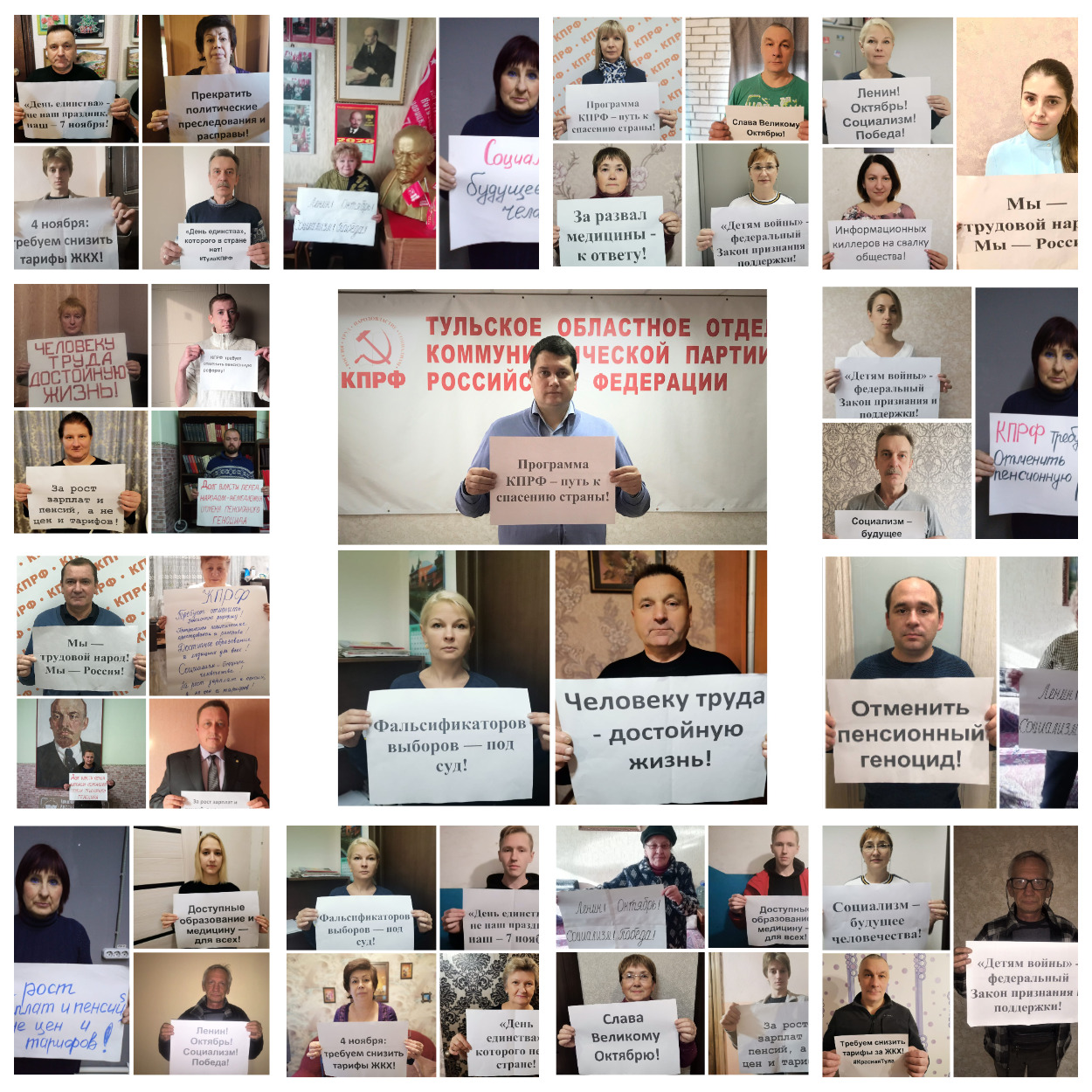Накануне праздника тульские коммунисты провели в социальных сетях два флешмоба - «4 ноября – не наш праздник!» и «Слава Великому Октябрю!» Члены КПРФ и их сторонники распространили в интернете свои снимки с размещенными на плакатах требованиями: «Человеку труда – достойную жизнь!», «Требуем отменить пенсионную реформу!», «За рост зарплат и пенсий, а не цен и тарифов!», «Программа КПРФ - путь к спасению страны!», «Социализм – будущее человечества!» Надо отметить, эти фотографии встретили живой отклик со стороны пользователей соцсетей.