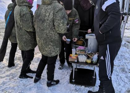 Горячий чай с лимоном и сладостями мы предлагали всем желающим! Люди приятно удивлялись такому, ведь угощение было абсолютно бесплатно. Подошли также и курсанты военного училища. Сначала они спросили, можно ли купить чай, а когда узнали, что мы просто так угощаем всех желающих, они позвали своих друзей. Поговорили со всеми, пообщались.