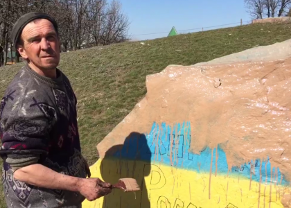 Село Трёхизбенка на Лёвом берегу Северского Донца освобождено совсем недавно. Тут нас ждёт другая картина. На центральной площади – памятник казачьему атаману Кондрату Булавину, а рядом с ним местный житель закрашивает памятный камень, аляписто размалёванный желто-голубыми цветами украинского флага.