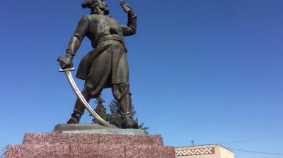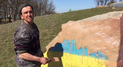 Село Трёхизбенка на Лёвом берегу Северского Донца освобождено совсем недавно. Тут нас ждёт другая картина. На центральной площади – памятник казачьему атаману Кондрату Булавину, а рядом с ним местный житель закрашивает памятный камень, аляписто размалёванный желто-голубыми цветами украинского флага.