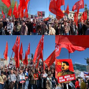В похожем формате прошла праздничная акция каменск-уральских коммунистов. Но там администрация города не смогла сдержать негодования от увиденного портрета И.В.Сталина и попыталась отобрать его у пенсионера-коммуниста. Однако товарищи отстояли право идти с большим портретом Великого Вождя и продолжили своё шествие.