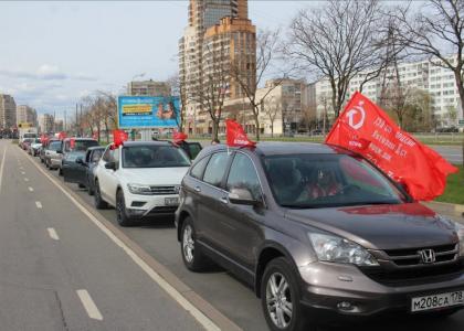 Рано утром колонна автомобилей с красными знаменами выехала на автопробег. Алые стяги привлекали внимание горожан, которые приветственно сигналили коммунистам. Во время движения машины остановились в парке Интернационалистов, где состоялись импровизированные выступления. Перед собравшимися выступили член ЦК КПРФ Ольга Архиповна Ходунова и первый секретарь Санкт-Петербургского горкома ЛКСМ РФ Егор Михайлов. Они напомнили о той героической роли, которую сыграли в войне простые солдаты, а также призвали не допустить подмены понятий и символов, которую пытается провести действующая власть. Была объявлена минута молчания, после которой активисты провели возложение цветов.