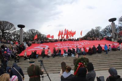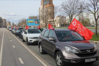 Рано утром колонна автомобилей с красными знаменами выехала на автопробег. Алые стяги привлекали внимание горожан, которые приветственно сигналили коммунистам. Во время движения машины остановились в парке Интернационалистов, где состоялись импровизированные выступления. Перед собравшимися выступили член ЦК КПРФ Ольга Архиповна Ходунова и первый секретарь Санкт-Петербургского горкома ЛКСМ РФ Егор Михайлов. Они напомнили о той героической роли, которую сыграли в войне простые солдаты, а также призвали не допустить подмены понятий и символов, которую пытается провести действующая власть. Была объявлена минута молчания, после которой активисты провели возложение цветов.