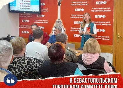 В Севастопольском городском комитете КПРФ советник Председателя ЦК КПРФ Маргарита Образцова встретилась с партийным активом и представителями народно-патриотического фронта - Союзом Советских офицеров, ВЖС «Надежда России», движением «За новый социализм». В ходе встречи обсуждались особенности проведения избирательной кампании-2022, которая будет проходить под знаком специальной военной операции, информационной войны и западных санкций против России.