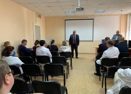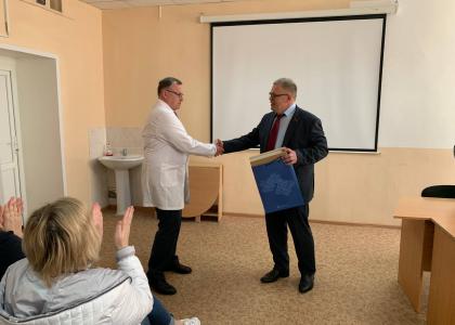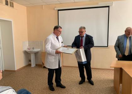 В Озёрской ЦРБ, Александр Наумов встретился с главным врачом Юрием Володиным. Они обсудили перспективы развития больницы, а также проблемы, которые стоят перед озёрскими медиками. Главврач подчеркнул, что его больница уже несколько лет находится в зеленой зоне и активно внедряет новые формы и методы работы. Затем заместитель Председателя Московской областной Думы Александр Наумов вручил сотрудникам ЦРБ Почётные грамоты и Благодарственные письма.