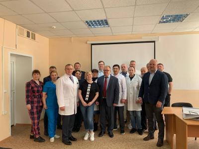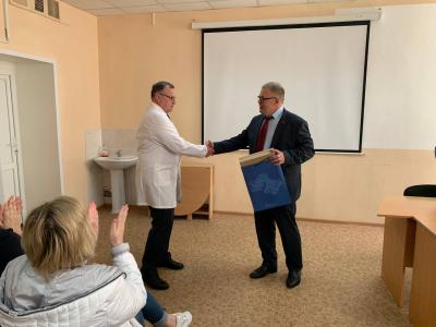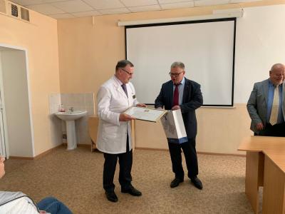 В Озёрской ЦРБ, Александр Наумов встретился с главным врачом Юрием Володиным. Они обсудили перспективы развития больницы, а также проблемы, которые стоят перед озёрскими медиками. Главврач подчеркнул, что его больница уже несколько лет находится в зеленой зоне и активно внедряет новые формы и методы работы. Затем заместитель Председателя Московской областной Думы Александр Наумов вручил сотрудникам ЦРБ Почётные грамоты и Благодарственные письма.